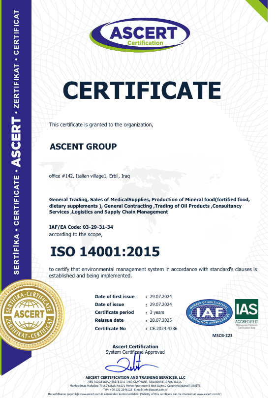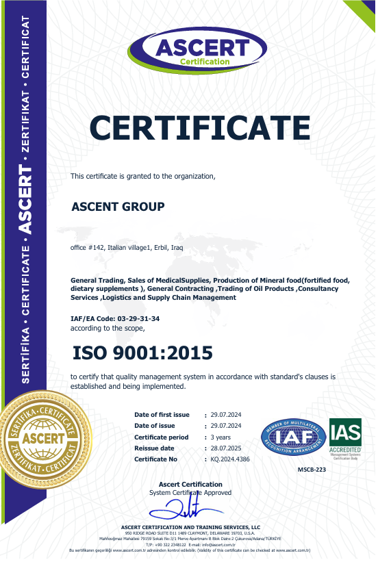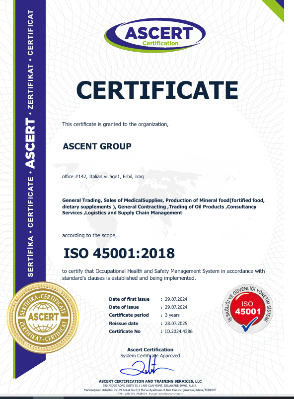 ISO Certification: Ascent Group is ISO certified, holding ISO 9001:2015 for Quality Management,ISO 14001:2015 for Environmental Management, and ISO 45001:2018 for Health and Safety Management. These certifications signify that the organization adheres to internationally recognized standards across key operational areas, demonstrating their commitment to continuous improvement, customer satisfaction, environmental responsibility, and the health and safety of their workforce. This ensures that their processes are efficient, reliable, and aligned with best practices in quality, environmental stewardship, and occupational health and safety.